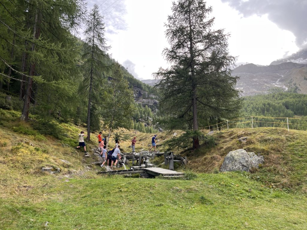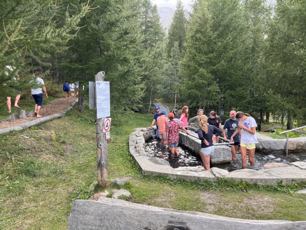 Hello! Jet lag has gotten the best of me the past two nights – but we are here in Saas Fee and starting to adapt to the time change! We had a great first day free skiing and doing drills on the glacier. The surface was great – icy/grippy – and we got lots of runs in to get back into it. After skiing on day 1 we went for a short hike and did some Kneipping – getting the blood flowing from our feet up through cold tubbing and walking on wood chips and gravel. It’s a thing here, and we love it!